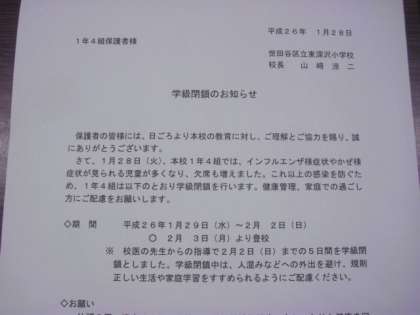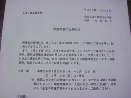 1年2組・1年4組は、インフルエンザ様症状、かぜ症状の児童の欠席が多くなりました。5年3組は、インフルエンザ様症状、かぜ症状に加え、感染性胃腸炎で欠席が増えています。そこで、この3つのクラスは、1月29日(水)〜2月2日(日)までの5日間を学級閉鎖といたします。登校は2月3日(月)です。
