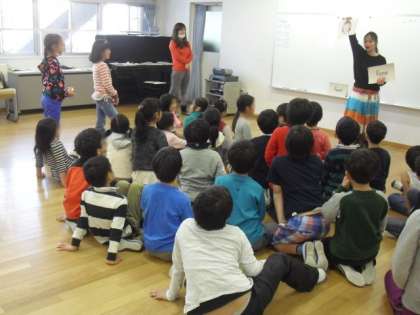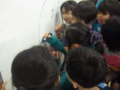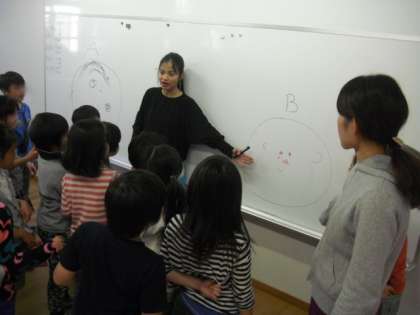 顔や顔の一部の英単語を学習しました。そして、アイマスクをして、単語を聞いて、顔に書きこんでいきました。まるで、「福笑い」でした。
