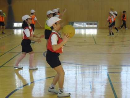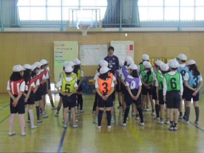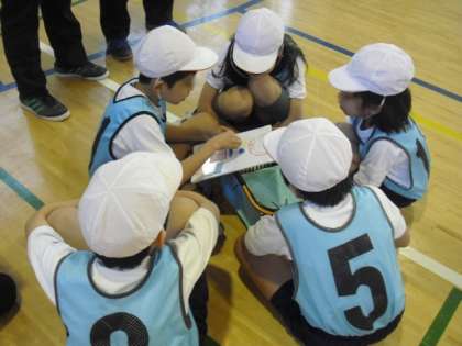 きちっと整列して、先生のお話を聞いた後、パスの練習をして、チームごとに自分たちの作戦をカードやボードを使いながら確かめました。真剣な表情が印象的でした。