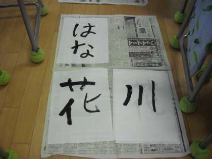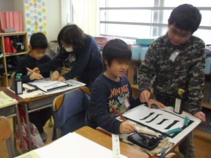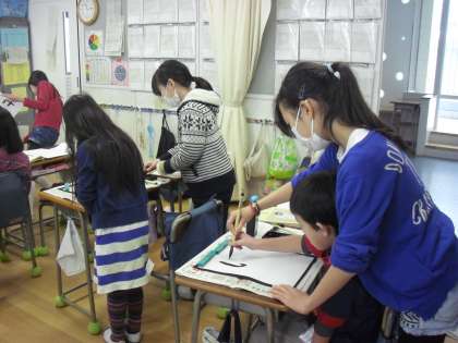 2年生の日本語の学習で「筆に親しもう」という単元があります。3年生から毛筆書写が始まるので、それに向けての学習です。今日は、2年生と5年生の兄弟学級(5-1と2-1、5-3と2-3)で一緒に書写の学習をしました。ペアになり、5年生がリードして2年生が書写に挑戦です。5年生が初めに手本を見せ、それを見ながら2年生は筆をもってドキドキしながら半紙にいろいろな文字を書きました。5年生が2年生の手を持って「こうやって書くといいよ。」とアドバイスをしたり、2年生の書いた文字を見て「すごく上手!!」と褒めたりと教室の中はとても温かい雰囲気に包まれました。2年生が書いた半紙は全て持ち帰っています。2年生は、3年生から始まる書写の学習が楽しみです。