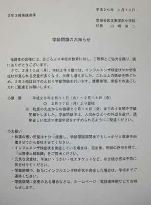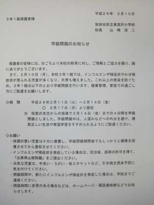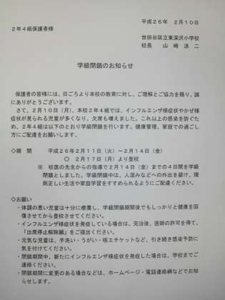 2年3組・2年4組・3年1組は、インフルエンザ様症状、かぜ症状の児童の欠席が多くなりました。そこで、この3つのクラスは、2月11日(火)〜2月14日(金)までの4日間を学級閉鎖といたします。登校は2月17日(月)です。