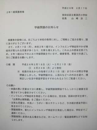 2年1組は、インフルエンザ様症状、かぜ様症状の児童の欠席が多くなりました。そこで、2月18日(火)〜2月21日(金)までの4日間を学級閉鎖といたします。登校は2月24日(月)です。