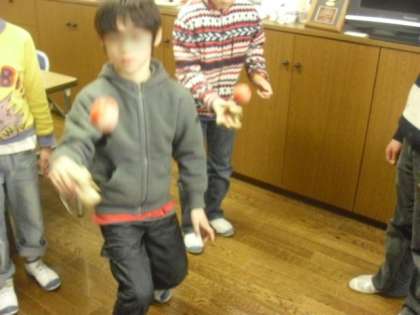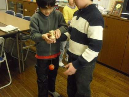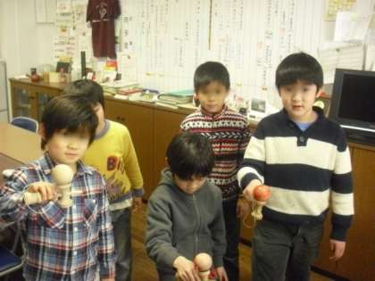 雪のため校庭が使えません。3年生がお昼休みに「けん玉していいですか」と校長室を訪ねてきました。けん玉3台に5人です。1回お皿にのったら交代するルールを自分たちで決めています。友達にアドバイスする子、友達を応援するかけ声をかける子、とっても爽やか。けん玉を通して今まで以上に仲良しになってね。