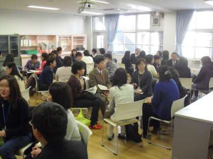 七校二園連絡協議会は、近隣の七つの小・中学校、高校と二つの幼稚園の先生方やPTAの方々、地域の青少年委員さんや、児童委員さん、町会長さん、児童館館長さん…と、多くの方々にお集まりいただきます。そして、子どもたちのよりよい成長に向け意見交換をし、地域が一体となって子どもたちを育てていこうという会です。今日は、50名の方々が参加してくださいました。