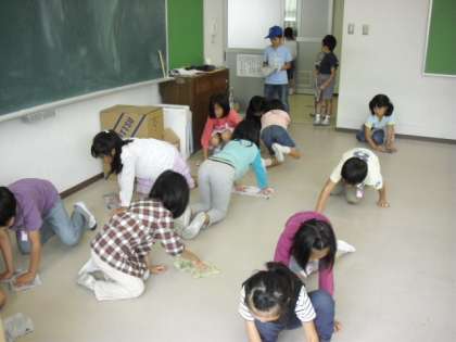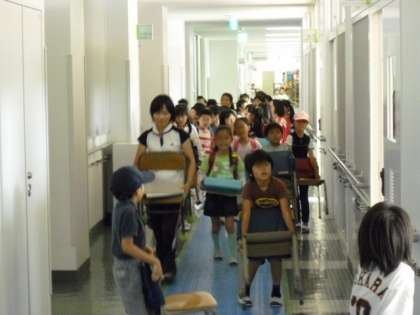 プレハブ校舎の2年生は、5年生に机運びを手伝ってもらい、新しい教室へ移動しました。今まで、お世話になったプレハブ校舎の教室の隅々まで、雑巾がけをしました。