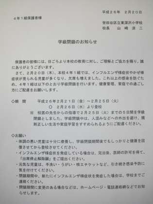 4年1組は、インフルエンザ様症状、かぜ様症状の児童の欠席が多くなりました。そこで、2月21日(金)〜2月25日(火)までの5日間を学級閉鎖といたします。登校は2月26日(水)です。