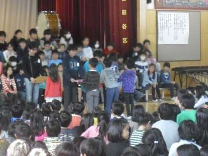 1年生から5年生までのお友達がつくった記念のカレンダーを、1年生が代表して6年生にプレゼント。