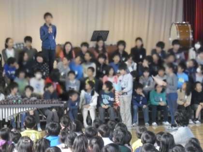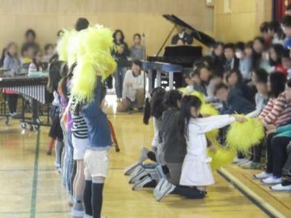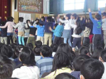 6年生に関するクイズの後は、各学年の出し物です。6年生のために趣向を凝らした出し物が続きます。まずは1年生(合奏・合唱・ダンス)⇒4年生(ハレルヤに合わせて)です。