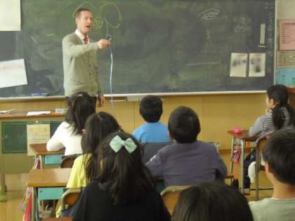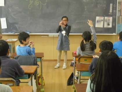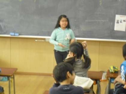 写真は、4年生の活動の様子です。マジックと絵が得意なガーウィット先生と一緒に、お友達のジェスチャーを見て、英語で職業を答えるゲームを楽しみました。