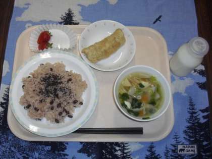 今日は、お赤飯です。6年生の卒業をお祝いしての献立です。