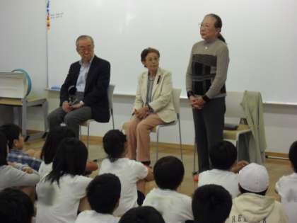 この会は、今年で5年目になります。学校支援コーディネーターの石村さんの紹介で、中塚良江さん、内藤つぎ子さん、田中宏実さんに来校いただき、広島・長崎の原爆、満州での経験や戦争中の生活等の話をしていただきました。授業で学んだことを実際に聞き、改めて戦争の悲惨さ、平和のありがたさを感じながら静かに、真剣に学ぶことができました。各自が感じたことを今後の生活にどういかせるか考え会を閉じました。(6年 古矢)