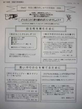 今年は、「語り合いましょう 子どもの育ち」のリーフレットを参考に、ひがし独自のテーマをつくり話し合いを行いました。話し合いは、時間を忘れるほど活発でした。ひがしのテーマは「自主性を育むために」と「思いやりの心を育てるために」です。