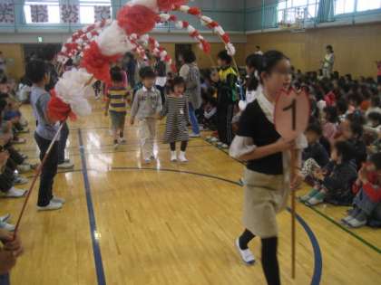 1年生が会場の体育館に入場し、会が始まりました。この会は、新旧の計画委員会や集会委員会のお友達が準備をし、進行を務めました。
