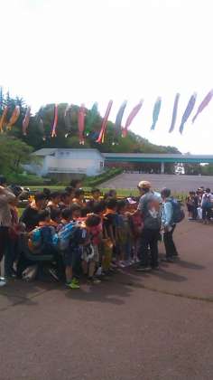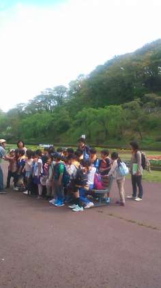 無事に到着しました。とてもいい天気で、お花がいっぱいです。みんなニコニコで記念写真です。