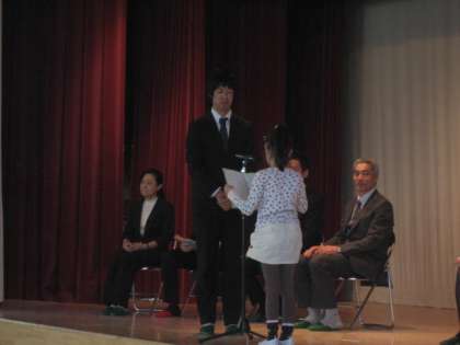 子どもたちからは、心のこもったメッセージを代表の児童が読み上げ、他の児童の書いた感謝の気持ちのつまった冊子を手渡しました。