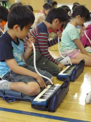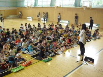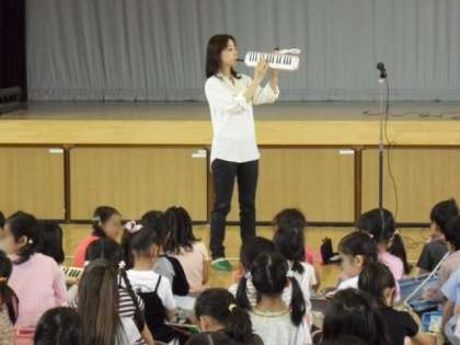 体育館に1年生全員が集まって、鍵盤ハーモニカの石川先生に基本的なことを教えていただきました。
