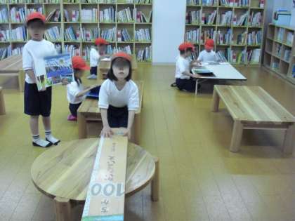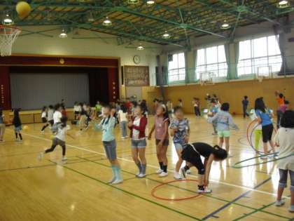 体育館は、4年生がいろいろな遊びで楽しんでいました。絵本室には、1年生が来ていました。教室で表現の練習をしている3年生の様子を見ている1年生もいました。