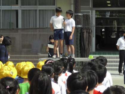 最後に、保健委員会のお友達が今月の目標を発表しました。「けがの防止につとめよう」「からだを清潔にしよう」です。廊下の右側を静かに歩くこともけがの防止につながります。ハンカチやちり紙を身につけることも体を清潔にすることにつながります。
