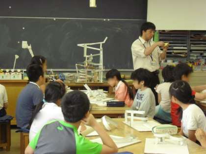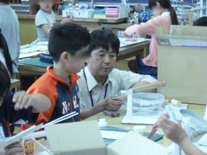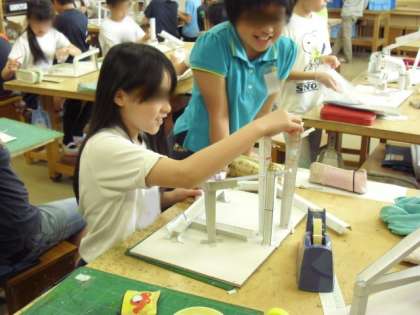 子どもたちは、直線コースやコーナー、トンネルなど工夫しながらつくっています。材料も工作用紙、針金、割り箸など様々です。誰もが試行錯誤しながら熱心に取り組んでいます。図工室は、材料や道具がとても使いやすくなっていますし、先生の作品が、子どもたちにとってとても参考になっています。