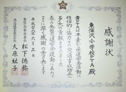 ひがしのPTAの皆様と深友会(町会)の交通安全活動が、玉川警察署より表彰を受けました。