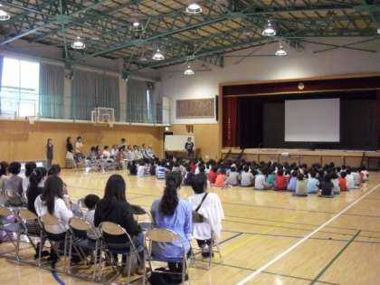 残念ながら、雨天のため校庭で実際に自転車に乗ることができませんでした。今年の自転車教室は、体育館で実施しました。