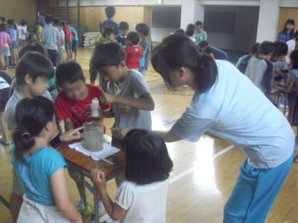 後半は、実験です。薬品で水の汚れが固まると、会場からは驚きの声が上がりました。2時間という短い間でしたが、子どもたちの目は輝き続けていました。