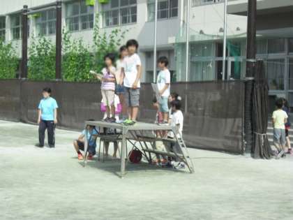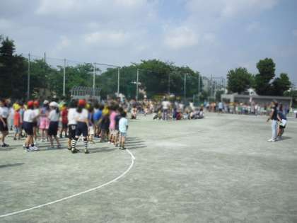 4つの場所に、それぞれキャラクターの名前が付いています。子どもたちが1つの場所を選び移動します。司会の集会委員がキャラクターの名前が書いてあるカードを引き、それと自分の場所が一致してしまうと「アウト」。数回繰り返し、最後まで残ったお友達には拍手!!
