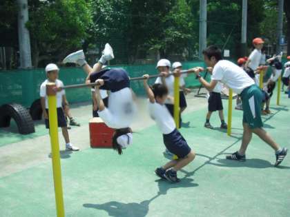 「親指ロック!!」と合言葉を言ってから鉄棒に跳び上がります。今日は、4年生の遠藤先生が、2年生の子どもたちの先生になって鉄棒の学習を進めました。