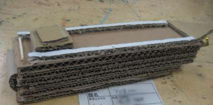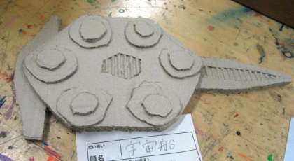 宇宙船の作品は、段ボールの色合いや肌触りをよく観察しており、さらに、表面を丸く切り取ったり、三角に切り取ったりして、波型の部分を効果的に見せています。