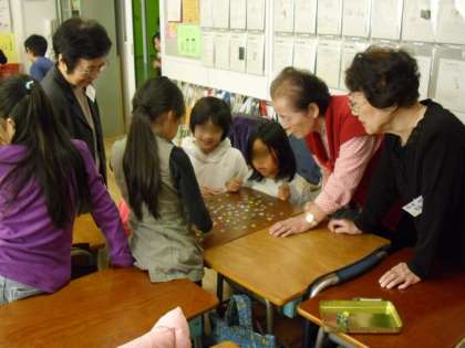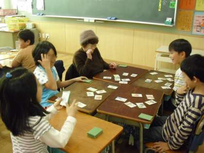 今日は15名の方々に来校していただき交流しました。百人一首やかるた、メンコ、けん玉、お手玉など、昔遊びを教えていただき楽しみました。