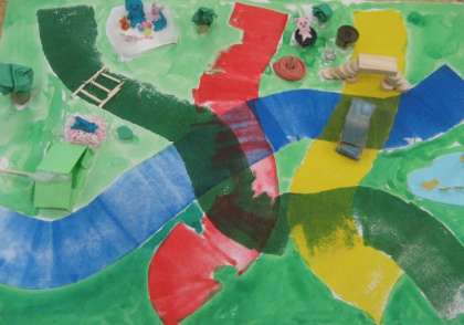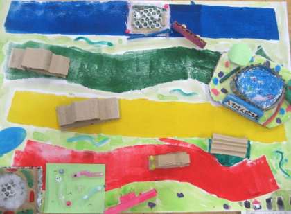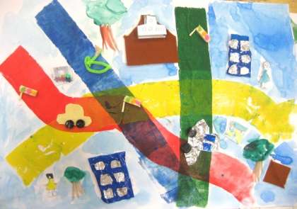 2枚目は「うみにうかぶまち」です。ローラー以外の部分を水色に塗ったあとに、題名がきまったのですが、セロファンで半透明なビルが水のイメージと重なって効果的です。海の上に走る道を想像させてくれます。