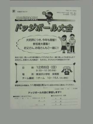 12月6日(日)に、地域班対抗のドッジボール大会が開催されます。プリントには、申し込み締め切りが11月9日となっていましたが、16日(月)まで申し込みが可能です。地域班の人と一緒にドッジボールで汗を流してみませんか。