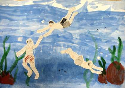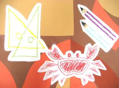 コラージュという紙を貼る技法、画材や技法を組み合わせるミクストメディア、絵具だけで描く、クレパスを使うなど、たくさんの工夫がみられます。クレヨンやクレパスなどもぼかしの技法をうまく使っています。