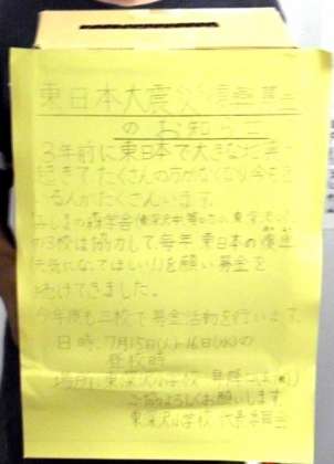 募金活動は、明日の朝も行います。「募金へのご協力、お願いしま〜す。」