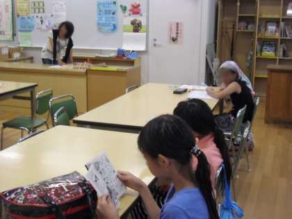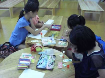 図書室では、水泳教室が終わった後の高学年のお友達が、本を読んだり学習をしたりしていました。絵本室では、ミニミニワークショップとしてしおりづくりを行っていました。とてもかわいいしおりを作ることができます。ひがしを卒業した中学生の先輩も小学生と一緒にしおりをつくりながら、手伝っていました。どうもありがとう。とてもうれしいです。