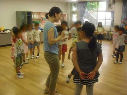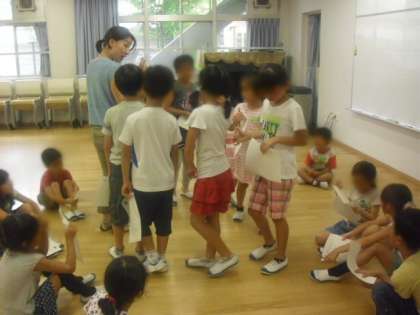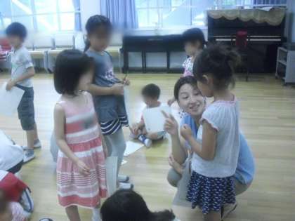 自己紹介ゲームの後、『Old McDonald Had a Farm.』の絵本の読み聞かせを中心に、歌を歌ったり、英語で動物の鳴き声を真似したり、ゲームをしたりしました。最初は「分からない。」と言ったり、固まってしまったりする子がたくさんいましたが、何度も繰り返すうちに自信がついた様子のみんな。やはり、「子どもは耳がいいな!!」と感心しました。