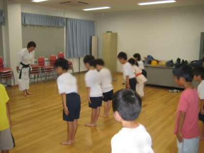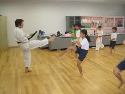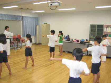 「エイッ!」「ヤッ!」と、気合を入れて中段突きを練習する子どもたちの表情は、真剣でとても恰好よかったです。とても貴重な体験になりました。