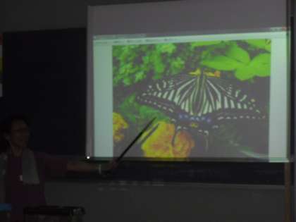 呑川緑道にあるエノキの木に、アカホシゴマダラの幼虫を発見しました。幼虫がどのような蝶になるのかを、図鑑や標本で確認をしました。理科室に帰ってきてからは、校舎のまわりにどのような虫がいたかを共有し、原口さんがご家庭で撮影されたアオスジアゲハの羽化の瞬間の画像を見させていただきました。