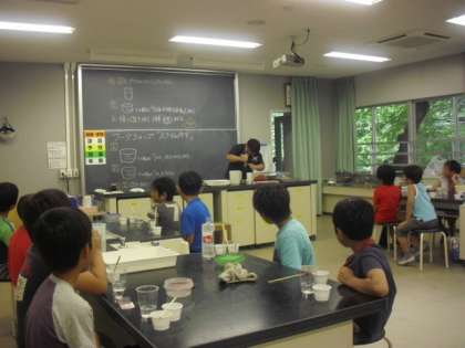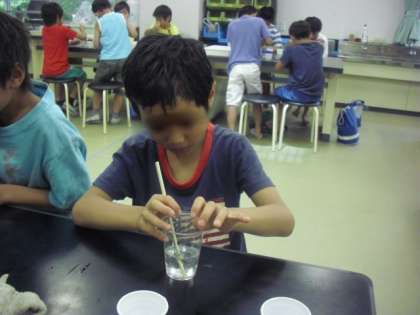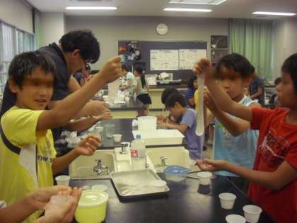 スライムを作るためには、洗濯のり:水:飽和水容液を1:1:1の分量を入れしっかり混ぜ合わせます。少しでも分量が異なったり、混ぜるタイミングが遅かったりするとよく伸びるスライムが作れませんが、みんなはよく話を聞き一生懸命混ぜたので、上手にスライムを作ることができました。