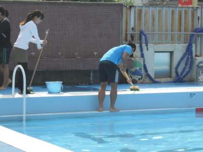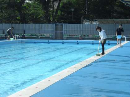 子どもたちが、少しでも気持ちよく安全に取り組めるようにと、先生方や補助員は、毎朝7時30分ころからプールサイドの掃除や、水中、水底の点検をしています。外部業者による水質検査等もクリアしています。