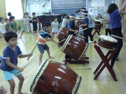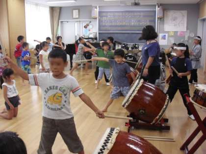 最後には、みんなで交代しながら、自信をもって「盆太鼓」を打ちました。決めポーズもばっちりでした。