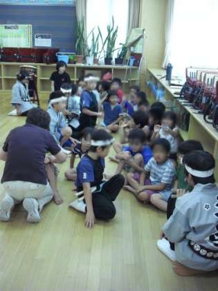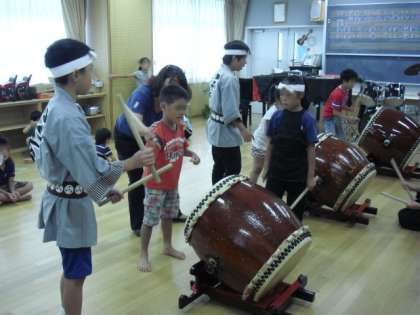 和太鼓を使って、盆踊りのリズムを体験しました。