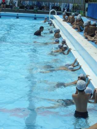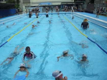 5年生の目標ですが、中学年の中にも大勢の子どもたちが先生方と一緒になって、カエル足や平泳ぎをマスターしようとがんばって練習しています。