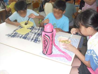 後半は、毎年恒例となっているバングラデシュのカレーをおいしくいただきました。朝早くから、本校のアルミ缶実行委員会の保護者の皆さんが作ってくださったスパイス・愛情たっぷりのカレーです。いつも食べているカレーと比べてルーのとろみは少ないのですが、ご飯との相性がよく、鶏肉にしっかりと味がしみこんでいて、本当においしかったです。あまりのおいしさに、どの子も夢中になって食べていました。