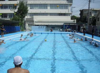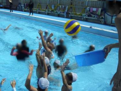 高学年の水泳教室では、指導の最後にお楽しみとして、男子対女子で2個のボールを使って水球遊びをしました。