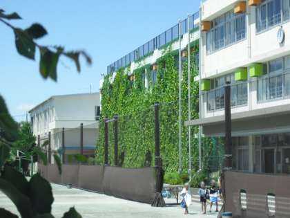 世田谷区により4月に、1年1組から1年4組の前に大きなプランター32個と屋上まで届くネットが設置され、ヘチマやゴーヤ、キュウリ、アサガオの苗が植えられました。そして今では、屋上まで届くほどに成長しています。