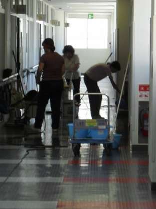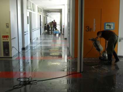 校舎内に人の出入りが少なくなるこの時期になると、2週間ほどの間で主事さんたちが廊下にワックスをかけてくれます。3階から順に作業を進めます。とても暑い中での作業ですので、主事さん方は、汗でびっしょりになってしまいます。