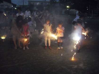 大勢のひがしのお友達や入学前のお友達、保護者の皆さん、地域の皆さんがいらして、手持ち花火や打ち上げ花火を楽しみました。