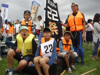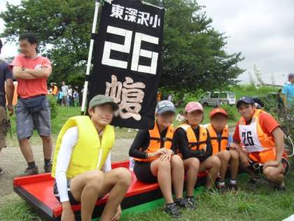 開会式の後、ひがしの「祭(22)」が5組目、「蝮(26)」が6組目でスタートします。今年は、例年より多摩川の水量が多く、流れも速いようなので、スピード感のあるレースが展開されそうです。そのため、スタートを待たずに先にゴール地点に向かい、そこで選手たちを迎えます。今年は、どんな展開が待っているのでしょうか?選手のみんな、「ファイト 一発!!」