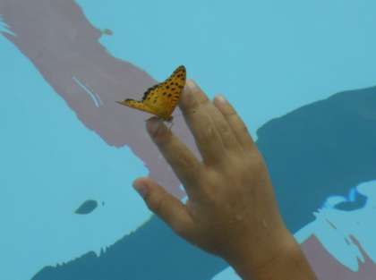 水慣れをしている2年生のお友達の指先にチョウがとまりました。何という名前のチョウでしょうか?
